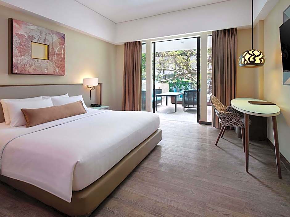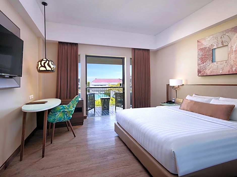 Deluxe Pool View, Balcony - 1 King Bed is 377 square feet and includes a king-size bed 150-183 width plus balcony.